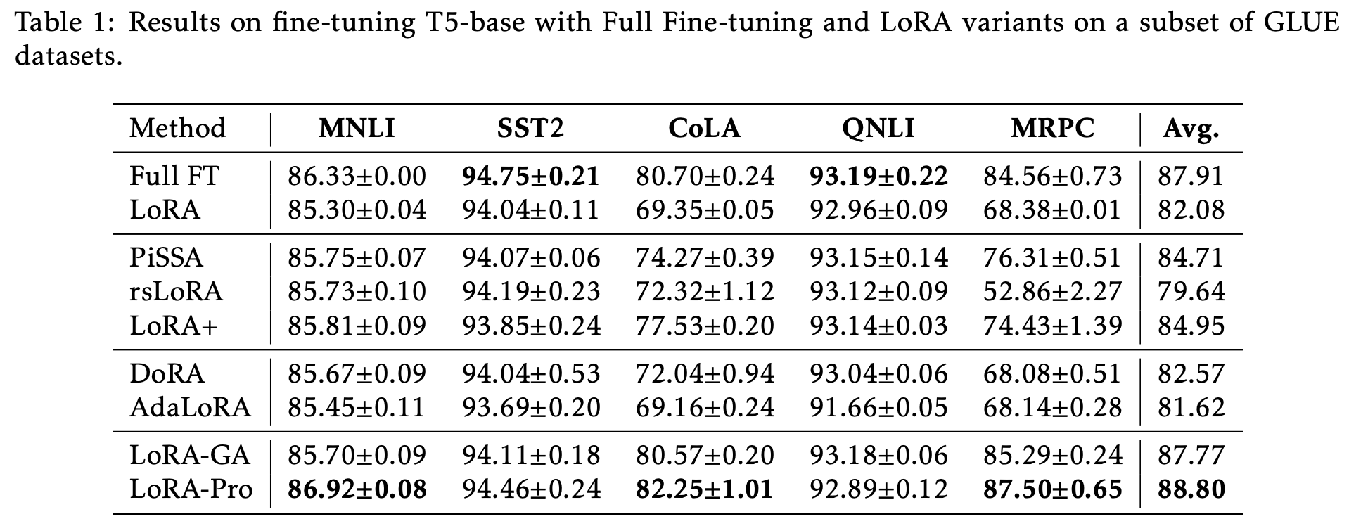 LoRA-Pro在GLUE上的实验结果更加惊艳,超过了全量微调的结果: