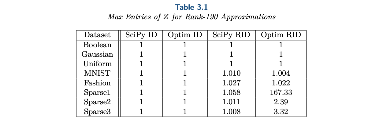 以上就是基于列驱QR分解的ID求解算法,也是SciPy内置的求解算法(rand=False)。注意该算法是无法保证$|z_{i,j}| \leq 1$或者$|z_{i,j}| \leq 2$的,但根据很多文献的反馈,在实践中它几乎不会出现$|z_{i,j}| > 2$,所以这算是一个比较良好的求解算法。此外,SciPy也内置了列驱QR分解,在scipy.linalg.qr中设置pivoting=True即可打开。