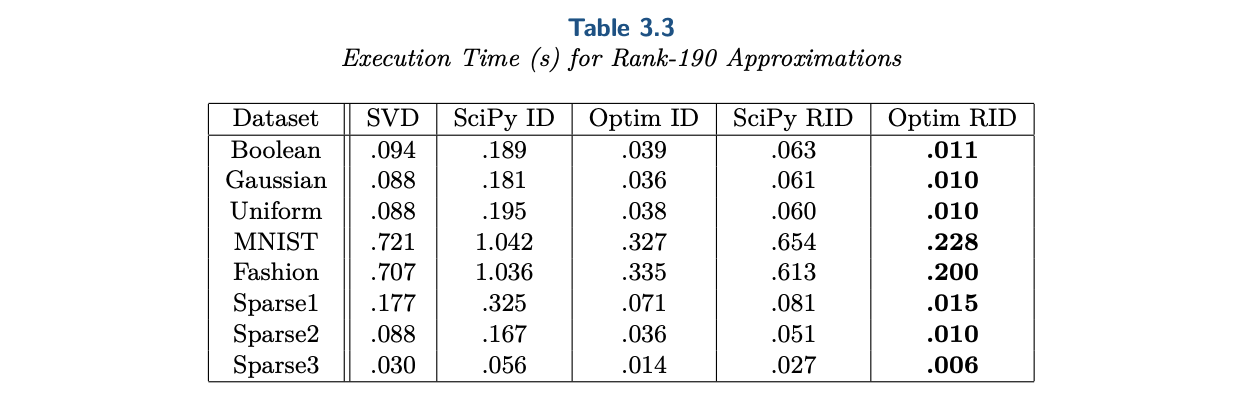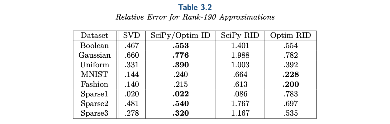 没有深究SRFT等复杂随机投影方法的另一个原因,是论文《Efficient Algorithms for Constructing an Interpolative Decomposition》发现更简单的列采样往往能得到更优的结果,而且还特别好理解,就是从$\boldsymbol{M}$中随机采样$k > r$列,然后用列驱QR分解从这$k$列中选出$r$列作为$\boldsymbol{C}$,最后再来根据$\boldsymbol{C}$求解$\boldsymbol{Z}$,这样就将列驱QR分解的矩阵大小从$n\times m$降低到$n\times k$。