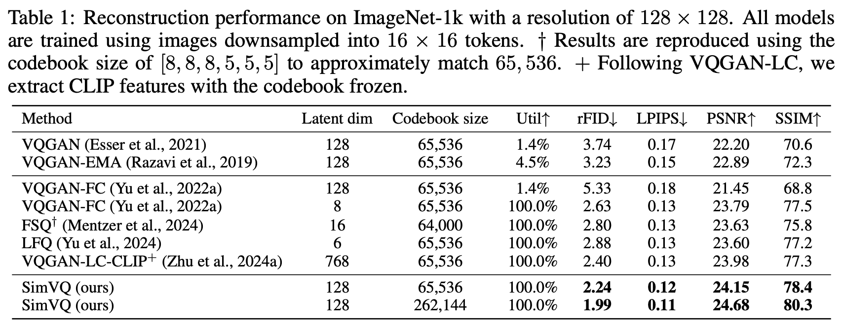 进一步思考和分析之前,我们先看看SimVQ的实验效果。SimVQ做了视觉和音频的实验,比较有代表性的是Table 1:
