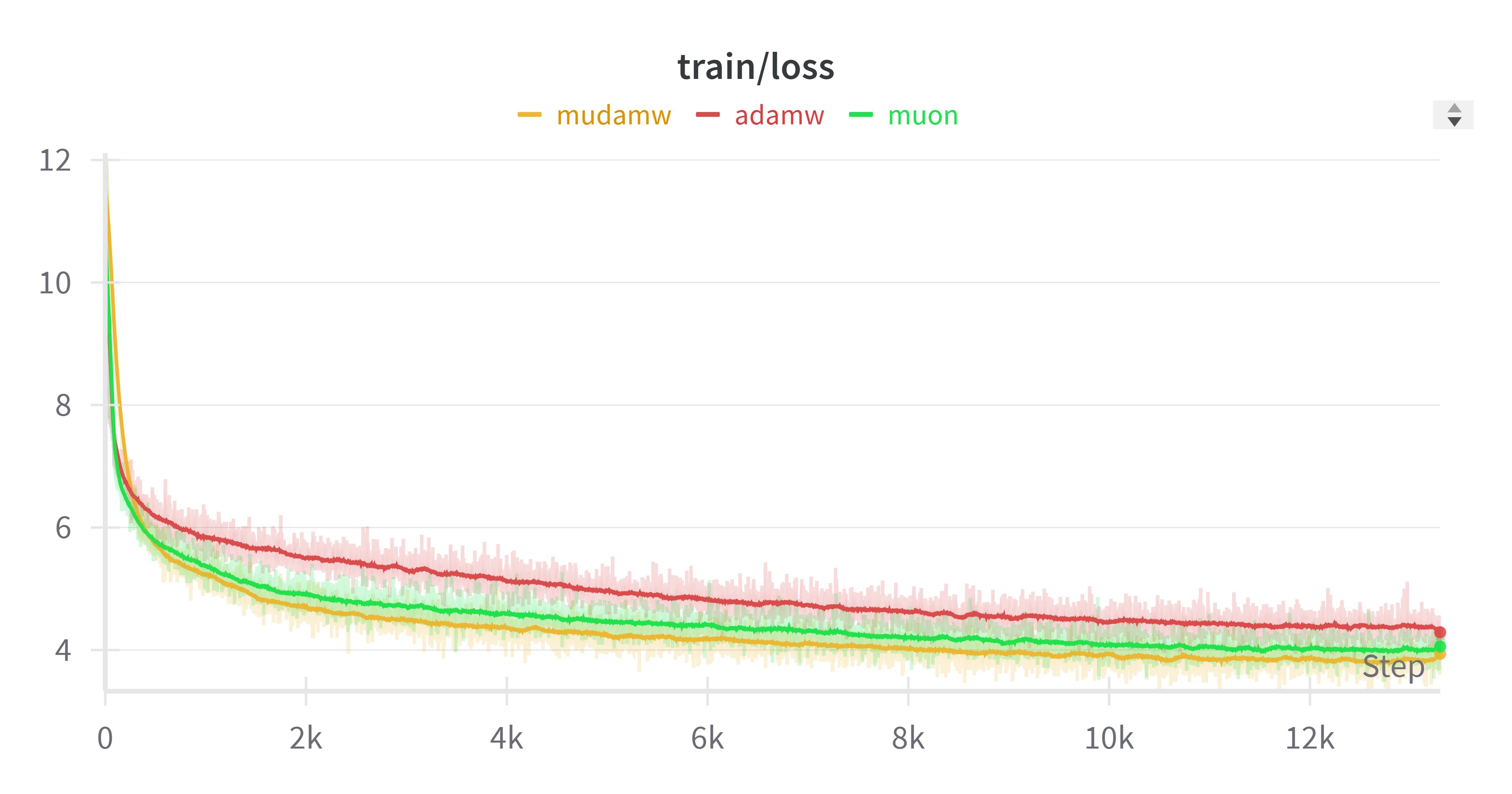 这样我们实际得到了广义的Muon优化器,标准的Muon是对动量$\mathop{\text{msign}}$,而它允许我们对任何现成优化器出来的更新量进行$\mathop{\text{msign}}$。无独有偶,前段时间推特上还真有人做了对Adam更新量$\mathop{\text{msign}}$的实验(对方称之为“Mudamw”,链接),发现效果比Muon还略好,如下图所示: