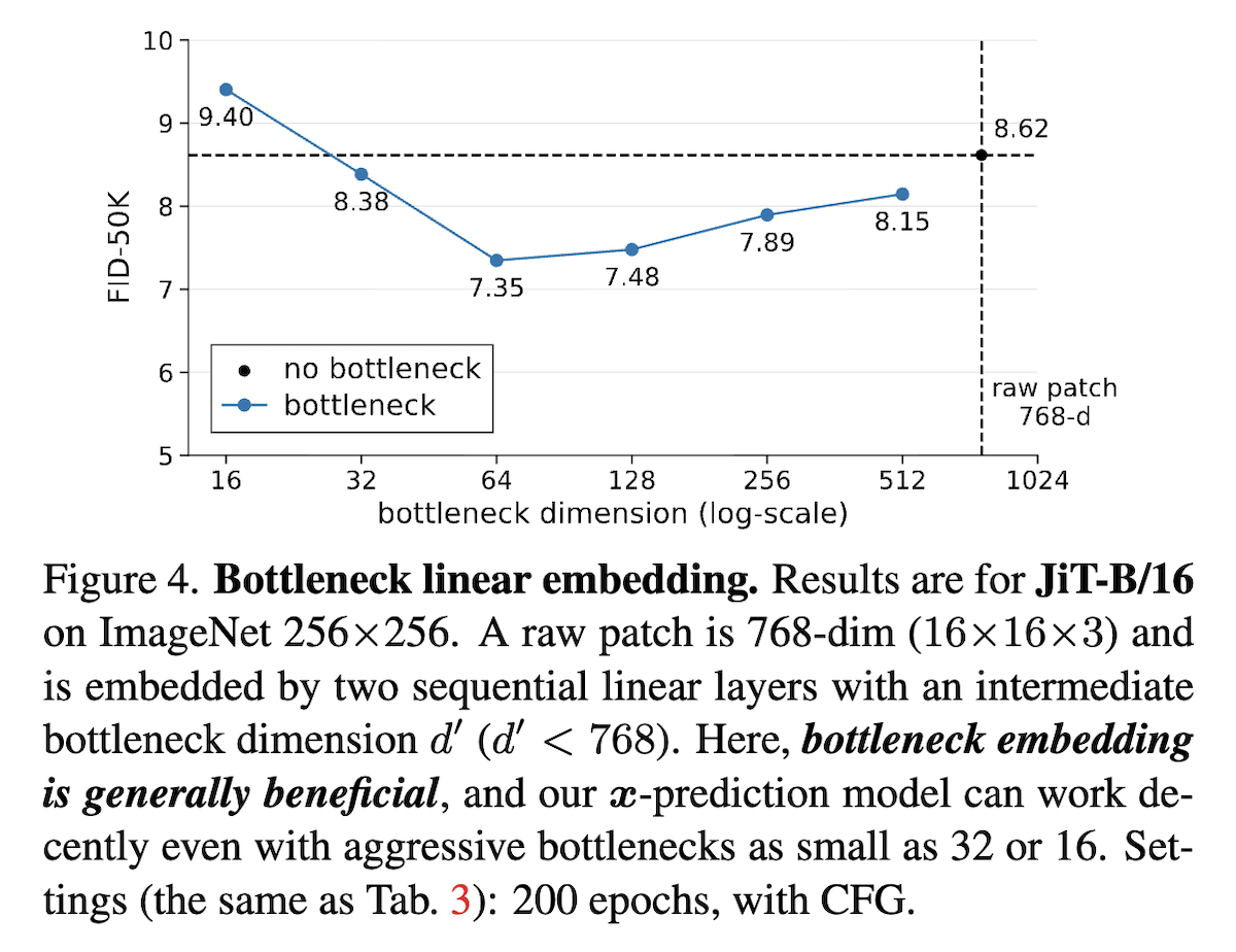 可以看到,如果没有低秩瓶颈(b),那么9种组合差别不大,但如果模型存在低秩瓶颈(a),则只有预测目标是数据($\boldsymbol{x}\text{-pred}$)才能成功训练,至于回归目标的影响则比较次要,这就肯定了预测数据的必要性。还有,论文发现主动给$\boldsymbol{x}\text{-pred}$的JiT增加适当的低秩瓶颈,反而有利于FID,如上图右。