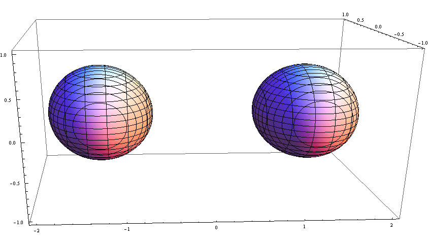 By 苏剑林 | 2012-12-18 | 33997位读者 |在天文爱好者眼中,黑洞是一个球体,其半径为$\frac{2GM}{c^2}$;这是广义相对论的施瓦兹黑洞的结果,也从经典力学推导推导出来,虽然用经典力学是错误的,但是对于多数的天文爱好者(包括笔者)来说,这是目前唯一的一种可行的理解方法(广义相对论那些复杂推导会让我们很崩溃的)。当然,事实上,黑洞不是一个球体,它只是一个密度很大的点。至于密度有多大,目前公认的说法是无穷大,但是严格的物理是不接受这个说法的,或者说,物理是不会接受任何无穷大的说法,所以现在积极发展量子引力理论来统一相对论和量子力学,不过这是另话了。$\frac{2GM}{c^2}$只不过是黑洞的视界,视界之内,我们就什么也不知道了。本文主要就从经典力学的角度探讨一下两个黑洞的合并过程中其视界的变化。读者将会发现,这些视界的形状相当有趣。