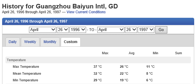 不过在Google搜索“Historical Weather”或者“Past Weather”就有很丰富的收获了。第一个网站就是: