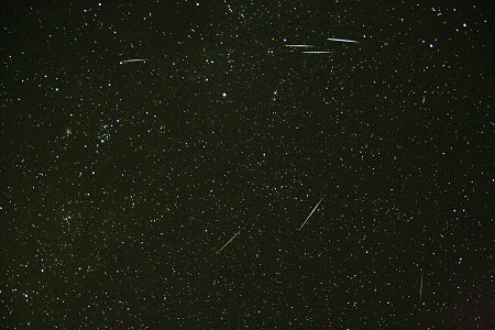 照相观测所需的设备主要是数码单反相机和广角镜头、三脚架、快门线以及足够的电池和存储卡。开始我们可以使用亮星来调焦,接上三脚架后,我们再进行取景。取景很有学问,能把辐射点放到视场中自然最好,而取上一些樗性的地景也是不错的选择。当然地景最好能有些许照明,不然在照片中就会显得不够亮了。接下来我们调节拍摄参数,我的经验是镜头最大光圈收一档或者不收,相机最高感光度减两至三档,白平衡调至日光档,曝光时间在10至20秒为宜,只要拍出来的背景天光不要过于明亮即可。当然最重要的是把相机设成连拍模式,用快门线锁住使其连续拍摄。面对转瞬即逝的流星,我们只有“守株待兔”了。