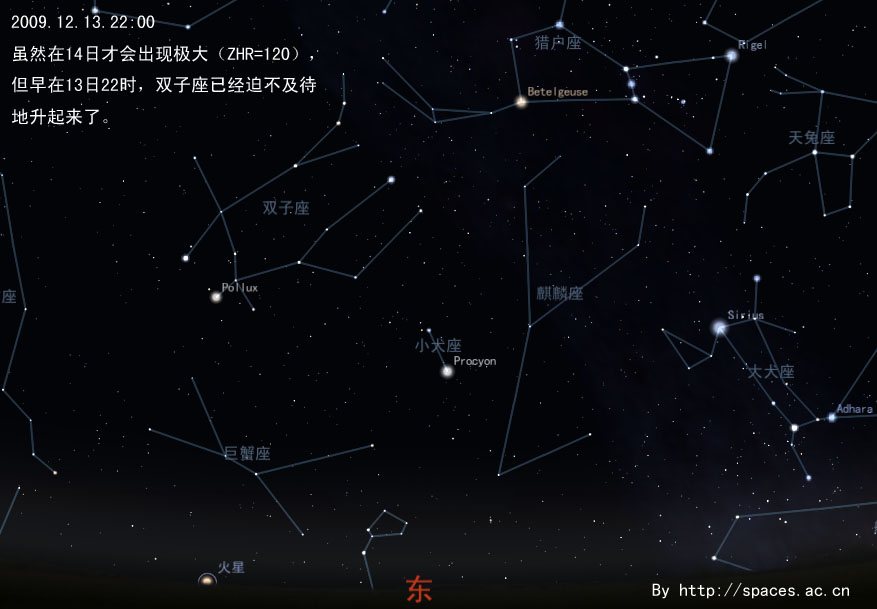 正是有了双子座流星雨的存在,才使得12月的夜空从来不乏亮点。与象限仪座流星雨、英仙座流星雨并称北半球三大流星雨的双子座流星雨不仅流量大,且十分稳定。同时,它还有亮流量多、观测效果好、极大时间长等特点。对于我们北半球中纬度地区来说,该流星雨辐射点在极大期间几乎整夜可见,午夜时分地平高度在 70度以上,可以称得上是全年观测条件最好的流星寸之一。而此时在南半球,黑夜本身就比较短暂,因此只有很短的时间观测条件较佳。双子座流星雨的活跃期并不太长,今年12月7日至17日间的夜晚,我们都有可能看到该群的流星。根据国际流星组织的预报,今年的极大可能出现在北京时间14日13时左右,ZHR 值可达120左右。通过对近20年双子座流星雨的观测,我们发现它的极大会持续两个小时以上。而且,对于比较暗弱的流星来说,较大流量甚至可以持续一天左右的时间。因此对于我国各地的天文爱好者来说,13日和14日两晚都是较为有利的观测时间,且今年双子座流星雨的极大恰逢农历十月廿七、廿八,黎明才会升起的残月对观测不会有影响。根据我们对前年双子座流星雨的观测结果分析,2007年基本没有月光影响,并出现了ZHR150以上的爆发。208年虽然月光影响严重,但在一个晚上我们仍观测到了上百颗流星,因此这个流星雨是非常值得大家观测的。