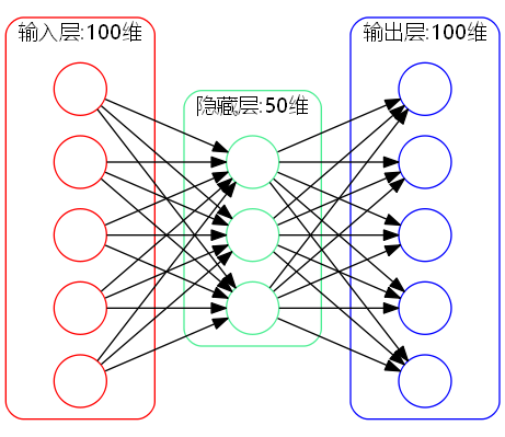 其中网络的输入和输出是一样的(都是100维),而中间隐藏层的节点是50维的。自编码器希望通过上述神经网络,训练一个简单的函数$x=x$,也就是希望输入跟输出是一样的。可是,在训练过程中,从输入层到隐藏层,维度从100维降低到了50维,意味着信息有所损失了,可是从隐藏层到输出层,维度又恢复为100维,既然信息已经损失,因此,理论上来说这个重构过程是不可能实现的。