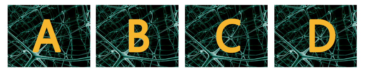 这是四幅不同的图像,读者是怎么看出它们之前的区别的呢?很显然,图片的背景都是一样的,不同的地方在于图片上面的字母,如果我要你在短时间内记住这几张图片的区别,那么读者只能够记住图片上的几个字母了。可是别忘了这是四张完整的图片,我们只记住四个字母,那就是把背景全部忽略掉了——丢失了大部分的信息!