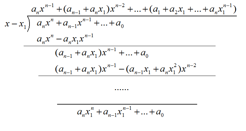 a 0 +a 1 x 1 +...+a n x n =(x−x 1 )[a n x n−1 +(a n−1 +a n x 1 )x n−2 +...+(a 1 +a 2 x 1 +...+a n x n−1 1 )]