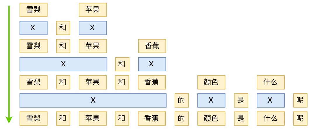 +---> (雪梨和苹果和香蕉)的(颜色)是(什么)呢