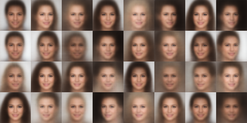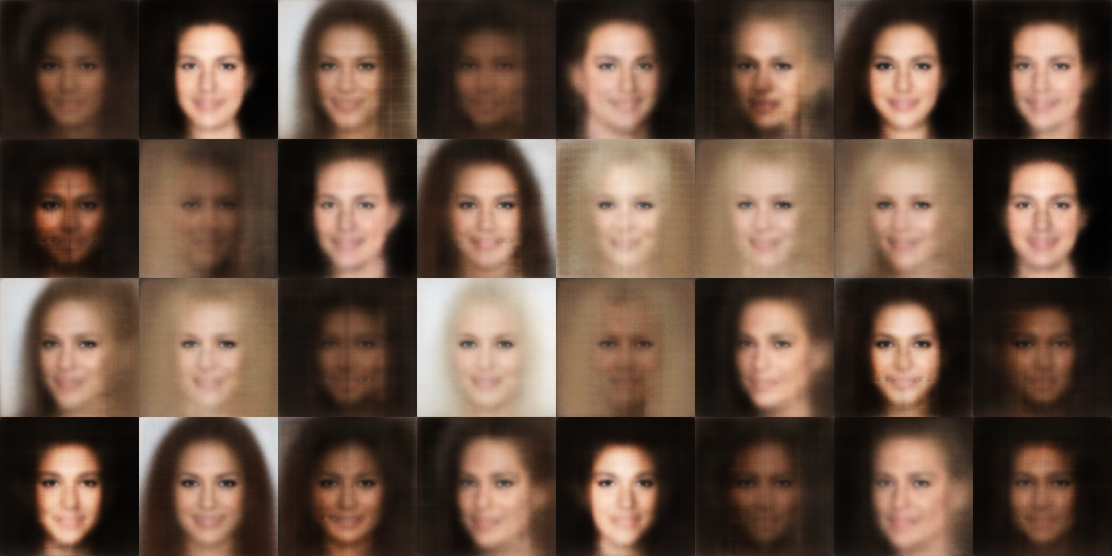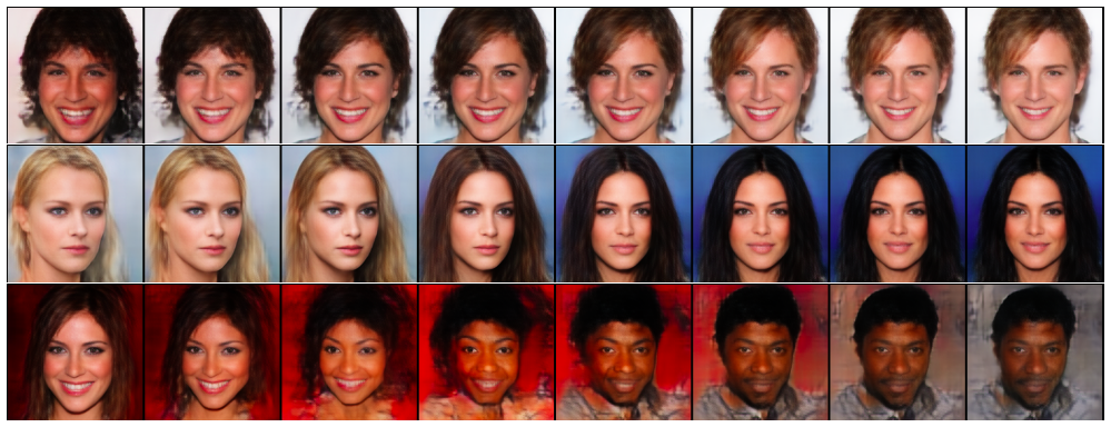 然后看看效果。算法的原理没毛病,但问题在于上面的算法中“最接近”用到了l2距离,而对于图像来说l2并不是一个好的距离,所以可以想象这个方法跟VAE一样有着模糊的毛病。事实上如果看CelebA的效果,它连VAE都比不上: