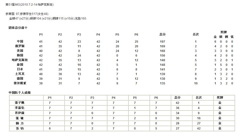 2010年7月2-14日在哈萨克斯坦共和国首都阿斯塔纳举行的第51届国际数学奥林匹克竞赛中,中国队6名参赛选手全部获得金牌,其中来自上海的Nie Zipei同学以本届惟一一个取得满分42分的成绩,而荣获绝对冠军,另外,Jialun Li为36分、Yikang Xiao为34分、Min Zhang为30分、Li Lai 为28分、Su Jun 为27分;中国队以总分197分(满分252),连续三年获得团体总分第一名(2007年获得亚军);中国队自1985年以来参赛25次,共获得过16次冠军;1998年未参加在台湾举行的比赛。本届比赛,俄罗斯队以169分获得亚军,美国队以一分之差屈居季军。