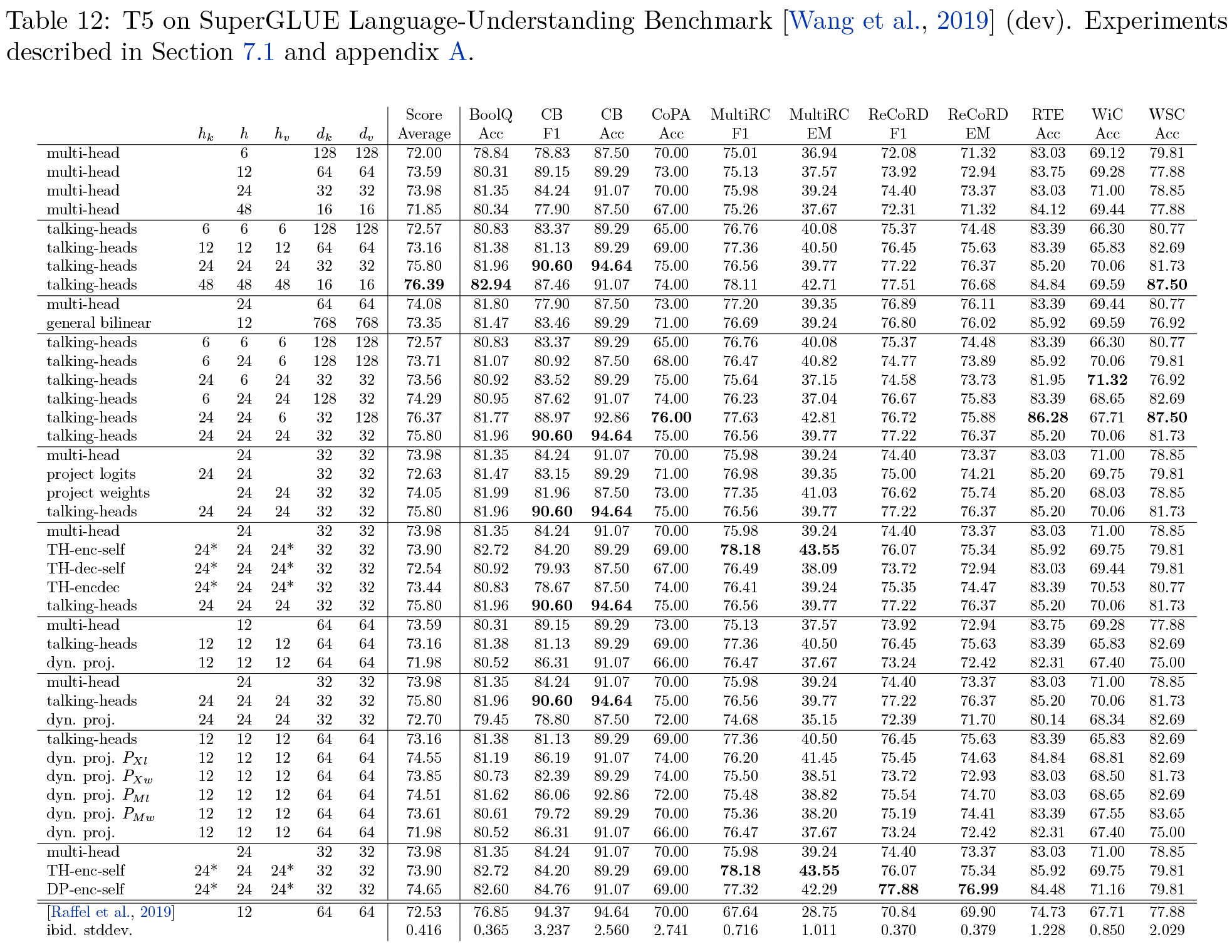 是不是真的有效,当然还是得靠实验结果来说话。这篇论文的实验阵容可谓空前强大,它同时包含了BERT、ALBERT、T5为baseline的实验结果!众所周知,BERT、ALBERT、T5均是某个时间段的NLP最优模型,尤其是T5还是处在superglue的榜首,并且远超出第二名很多,而这个Talking-Heads Attention则几乎是把它们的辉煌战绩又刷到了一个新高度!
