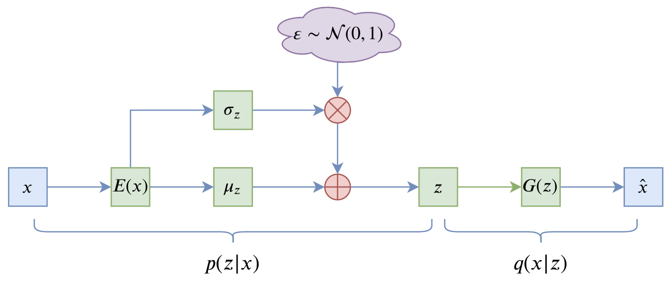这里我们简单回顾一下VAE模型,并且讨论一下VAE在NLP中所遇到的困难。关于VAE的更详细介绍,请读者参考笔者的旧作《变分自编码器(一):原来是这么一回事》、《变分自编码器(二):从贝叶斯观点出发》等。