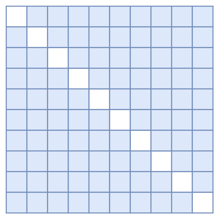 首先,我们知道Transformer的核心运算是$Attention(\boldsymbol{Q},\boldsymbol{K},\boldsymbol{V})$,在BERT里边$\boldsymbol{Q},\boldsymbol{K},\boldsymbol{V}$都是同一个,也就是Self Attention。而在MLM中,我们既然要建模$p(x_i|\,\boldsymbol{x}\backslash \{x_i\})$,那么第$i$个输出肯定是不能包含第$i$个token的信息的,为此,第一步要做出的改动是:去掉$\boldsymbol{Q}$里边的token输入,也就是说第一层的Attention的$\boldsymbol{Q}$不能包含token信息,只能包含位置向量。这是因为我们是通过$\boldsymbol{Q}$把$\boldsymbol{K},\boldsymbol{V}$的信息聚合起来的,如果$\boldsymbol{Q}$本身就有token信息,那么就会造成信息泄漏了。然后,我们要防止$\boldsymbol{K},\boldsymbol{V}$的信息泄漏,这需要修改Attention Mask,把对角线部分的Attention(也就是自身的)给Mask掉,如图所示。