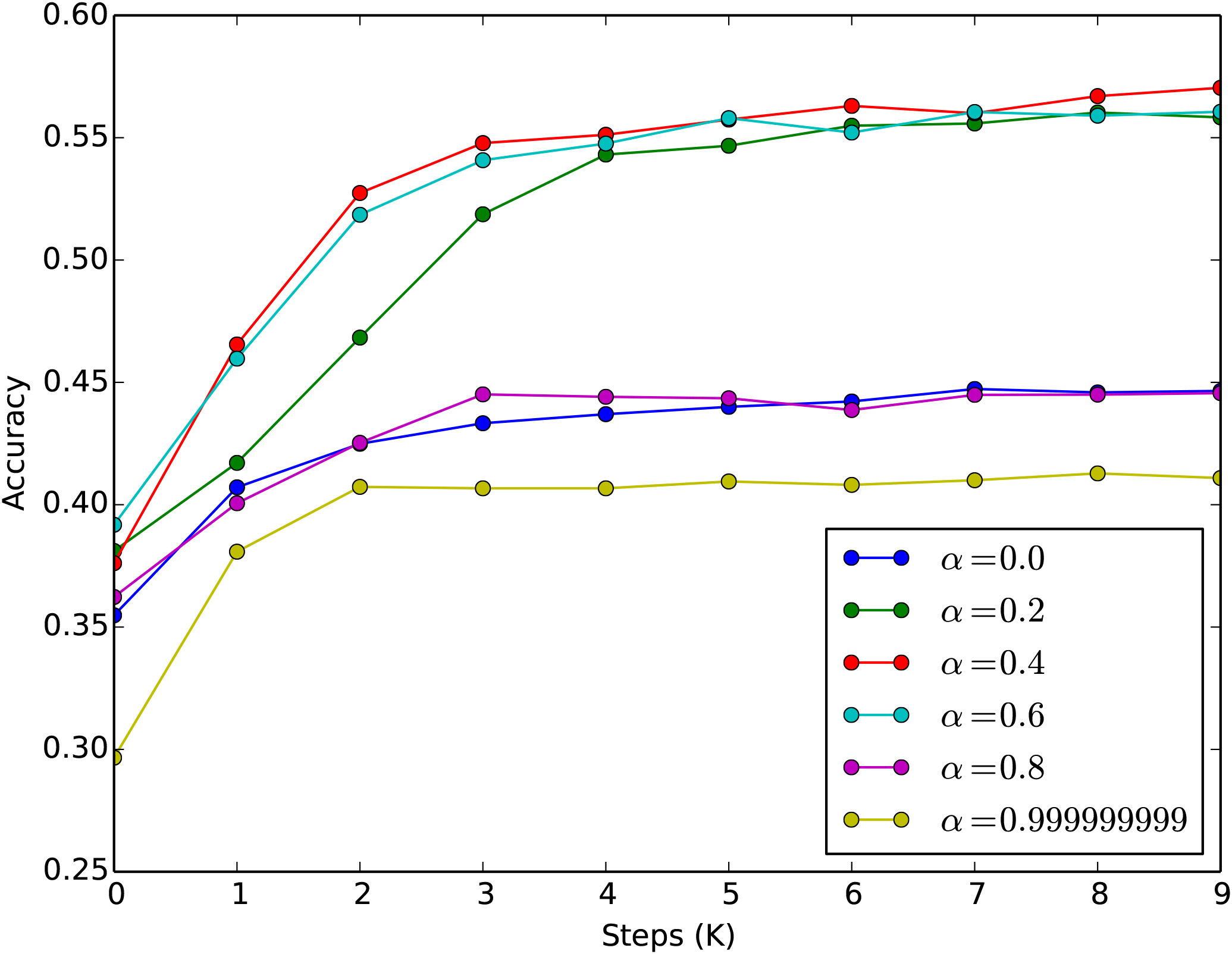至于效果,笔者首先测了MLM任务,直接将最大长度设为1536,然后加载训练好的RoBERTa权重,发现MLM的准确率大概是38%左右(如果截断到512,那么大概是55%左右),经过finetune其准确率可以很快(3000步左右)恢复到55%以上。这个结果表明这样延拓出来的位置编码在MLM任务上是行之有效的。如果有空余算力的话,在做其他任务之前先在MLM下继续预训练一会应该是比较好的。同时,我们对不同的$\alpha$也做了实验,表明$\alpha=0.4$确实是一个不错的默认值,如下图所示。