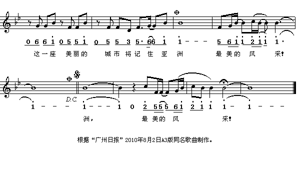 其中,《日出东方》的作曲是知名曲作家李海鹰,作词是朱海。歌曲名字与广州亚运标识五羊上方绚丽的太阳形象完全契合,体现了克服困难取得胜利的体育精神,同时也有亚运火炬薪火相传、永不熄灭的含义。《重逢》的作曲是捞仔,作词是徐荣凯。歌曲取名重逢,突出了亚运会不仅是亚洲的运动盛会,也是亚洲兄弟姐妹四年一次的盛大友谊聚会,亚洲虽然辽阔,但亚洲人民之间的深厚友谊缩短了彼此的距离。《最美的风采》则是由香港著名作曲家金培达作曲,广州知名音乐人陈小奇作词。歌曲将“花海”与“运动会”的意象巧妙地融为一体,彰显出广州作为“花城”及亚运会主办城市所具有的风采,及“和谐亚洲,激情盛会”的主题。