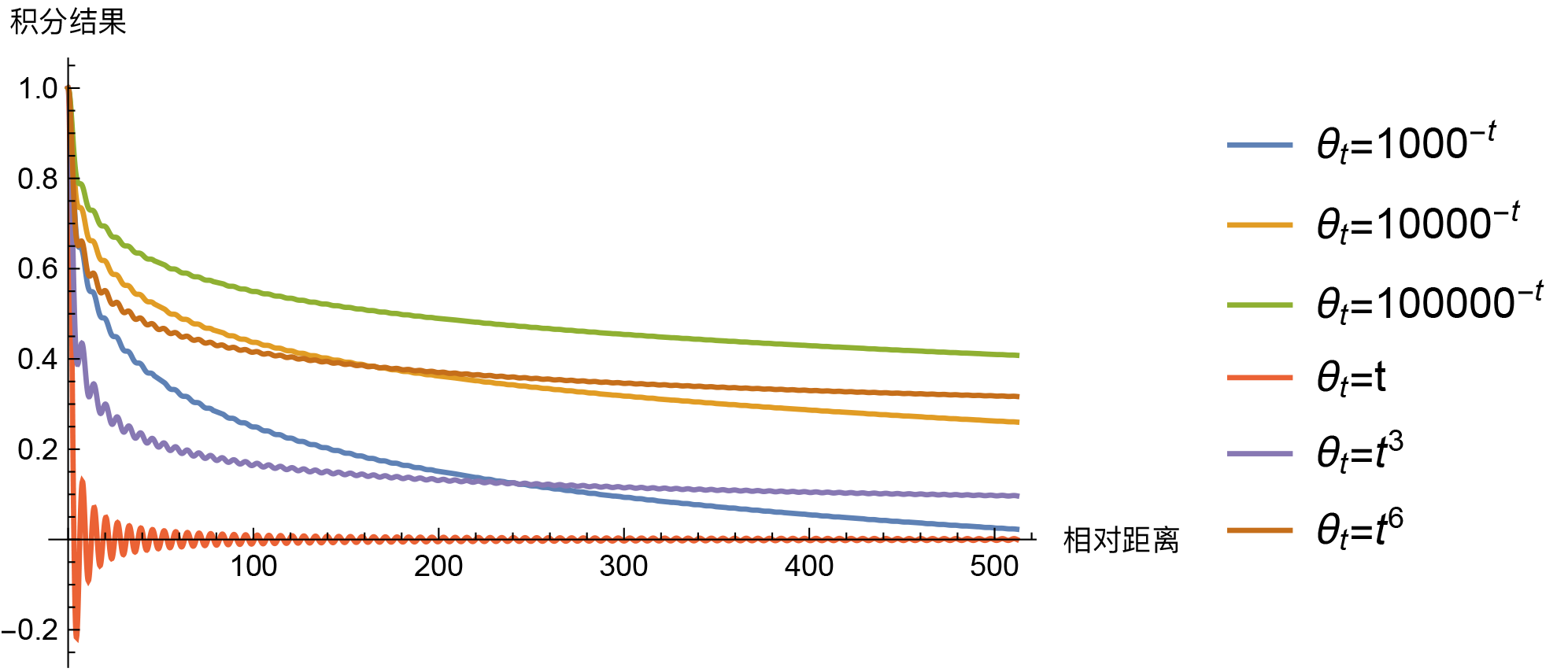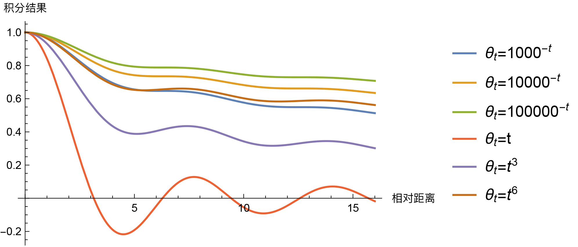 这样问题就变成了积分$\int_0^1 e^{\text{i}(m-n)\theta_t}dt$的渐近估计问题了。其实这种振荡积分的估计在量子力学中很常见,可以利用其中的方法进行分析,但对于我们来说,最直接的方法就是通过Mathematica把积分结果的图像画出来: