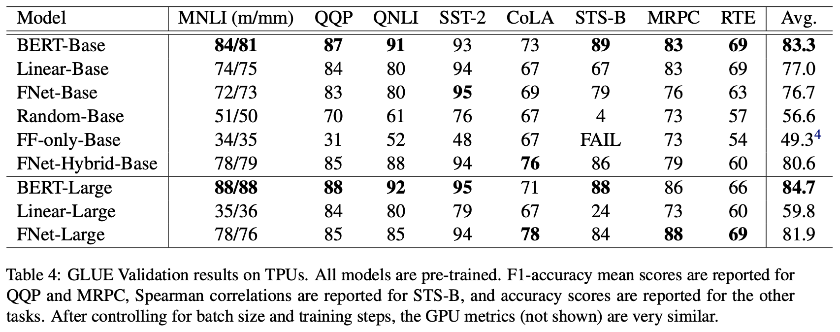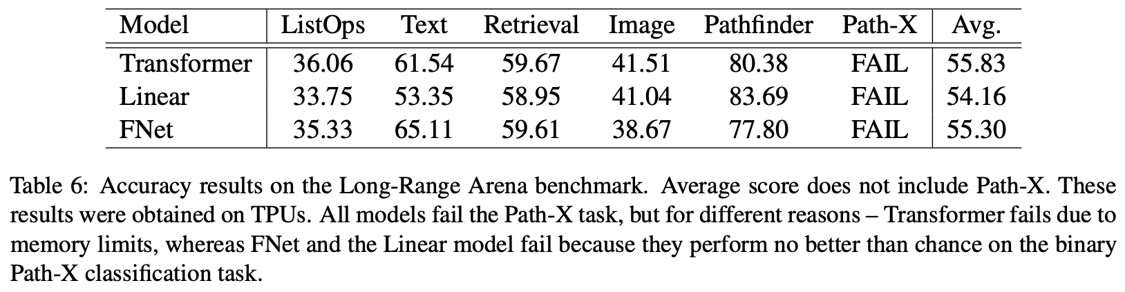 FNet的部分效果如下表。其实从预训练和下游任务的效果上来看,FNet并没有什么优势,不过它在Long-Range Arena(一个测试模型长程能力的评测榜单)上的效果倒是不错。