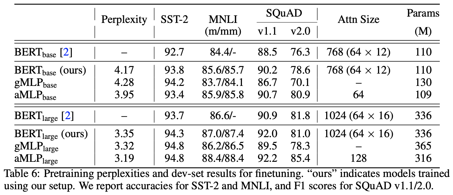 论文做的实验比较全面,包括CV和NLP的。从论文所报告的效果来看,gMLP略差于标准的Self Attention,而aMLP则是普遍优于Self Attention,这进一步肯定了门控机制的价值。只不过不管是gMLP还是aMLP,人工堆砌的味道太重了,要水一篇paper还可以,但个人认为没有给模型的发展方向带来什么新的启发。