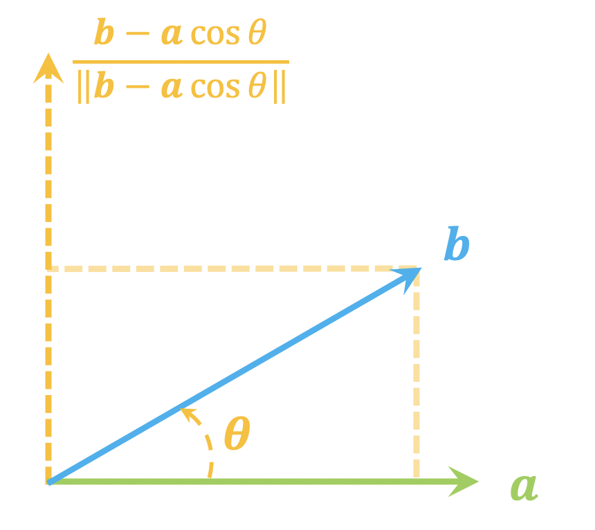 如上图所示,通过正交分解我们可以得到跟$\boldsymbol{a}$垂直的向量$\boldsymbol{b} - \boldsymbol{a}\cos\theta$,然后标准化后就可以得到一个标准正交基: