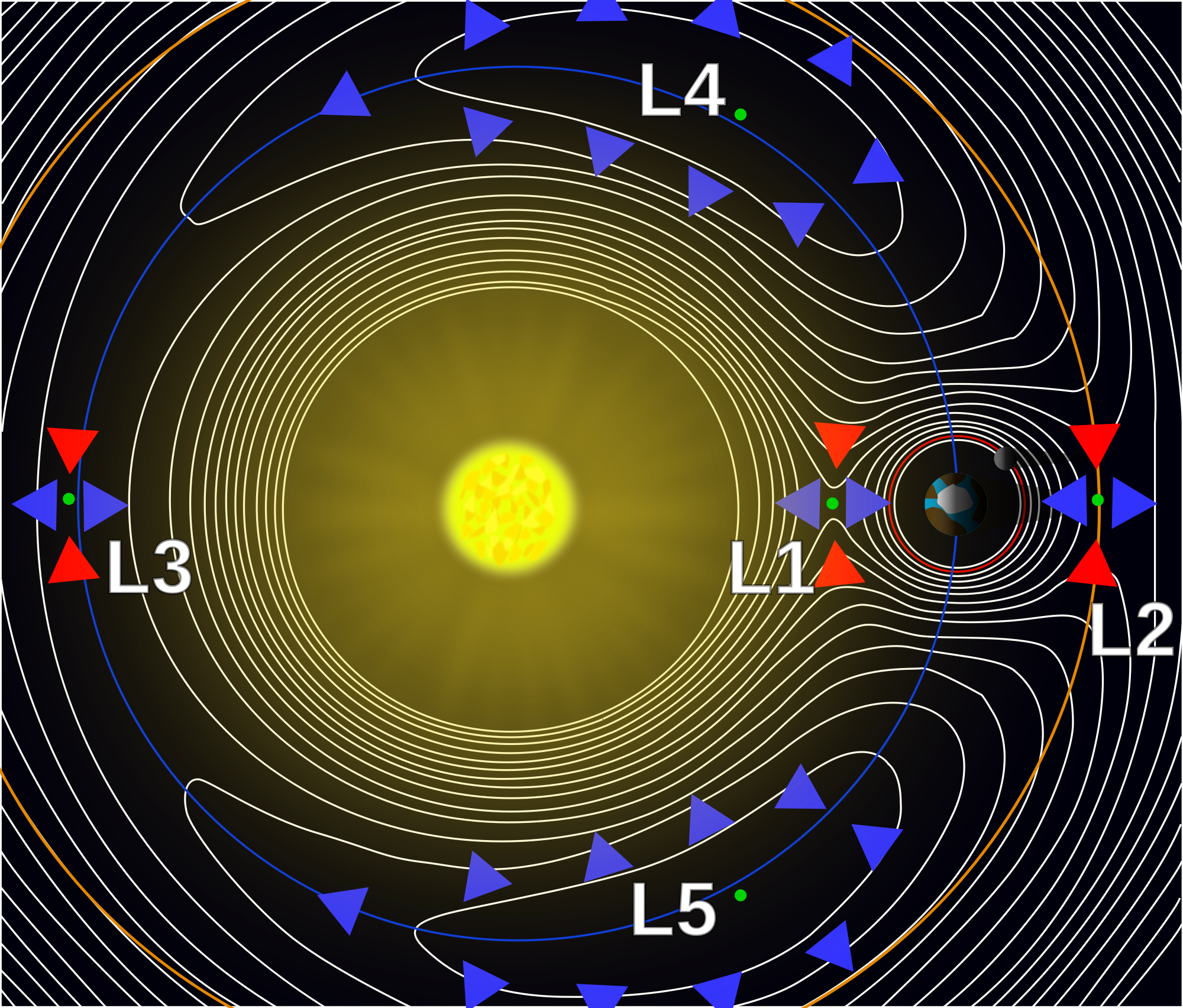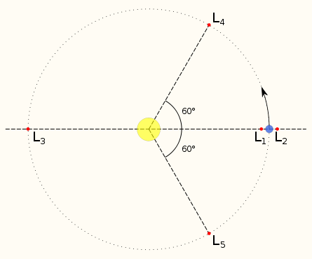 换句话说,位于地球的拉格朗日点的小质量天体,它的公转周期与地球相同。根据这一特点,我们可以利用高中向心力的知识,简单地求出拉格朗日点的位置所在。因为小质量天体也在做圆周运动,它的向心力来源于太阳对它的引力与地球对它的引力的合力在向径方向的投影,所以根据向心力公式列出方程,即可以得出答案。有兴趣的读者可以自己推导,在此不详述。