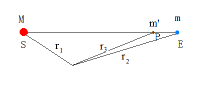 由于三者共线,我们可以设定$\vec{r}_2-\vec{r}_1=\vec{r},\vec{r}_3-\vec{r}_1=k\vec{r},|\vec{r}|=r$,太阳、地球、第三天体的质量分别为M,m,m' ,可以得出
