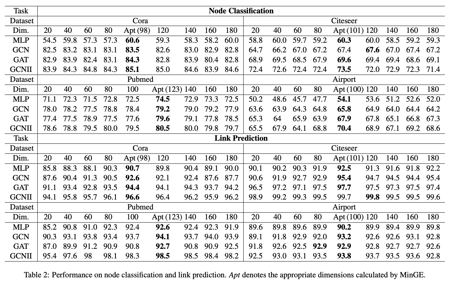将特征熵和结构熵结合后,用它计算出来的结果作为图网络的嵌入维度来进行各种图任务,实验结果显示该方法确实能得到较优的维度选择结果: