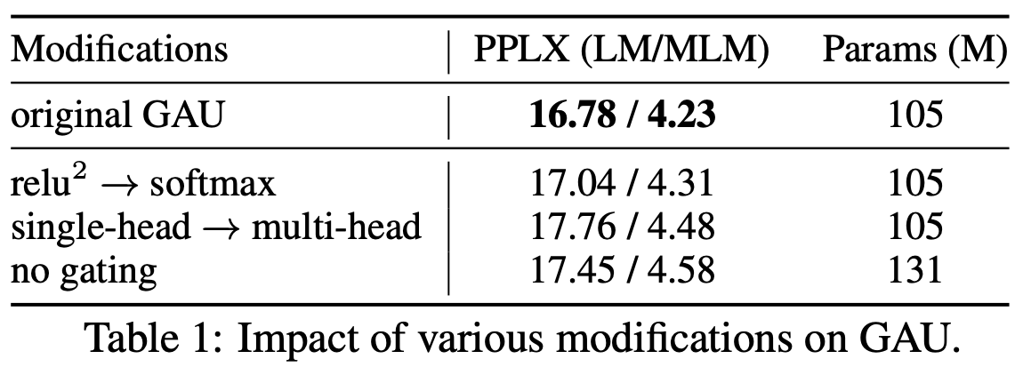 既然存在这些解决方案,那为什么我们还说“Attention与Softmax更配”呢?GAU的$\text{relu}^2(\cdot)$哪里不够配呢?首先,我们看GAU原论文的消融实验,显示出$\text{relu}^2(\cdot)$换成Softmax,效果基本是一致的: