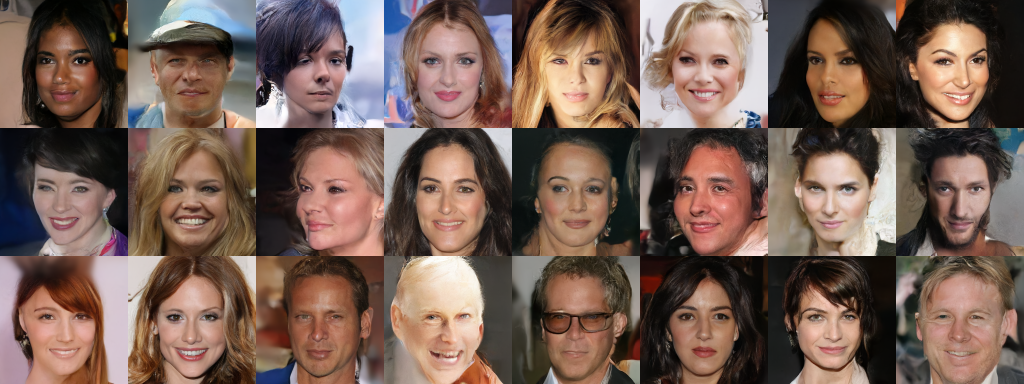 注意,笔者的实现并非严格按照DDPM原始开源代码来进行,而是根据自己的设计简化了U-Net的架构(比如特征拼接改为相加、去掉了Attention等),使得可以快速出效果。经测试,在单张24G显存的3090下,以blocks=1,batch_size=64训练128*128大小的CelebA HQ人脸数据集,半天就能初见成效。训练3天后的采样效果如下: