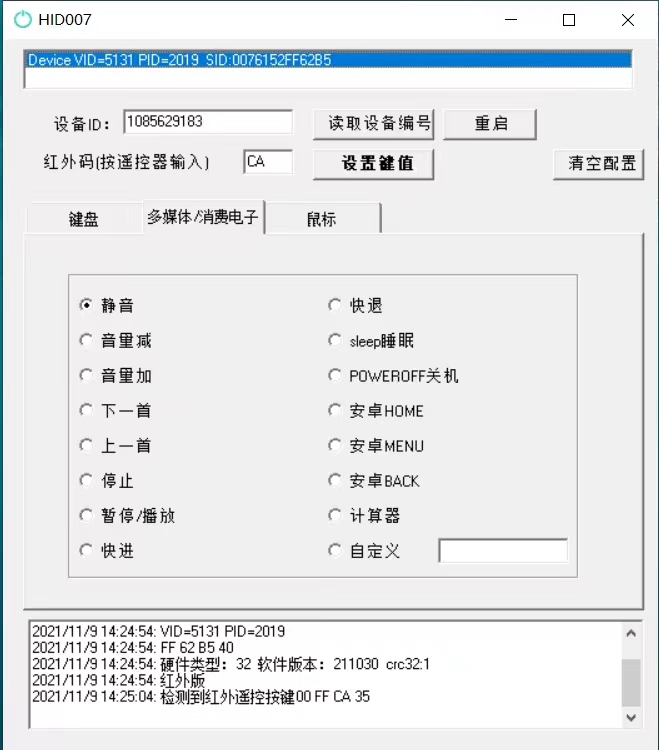 这个东西的作用是什么呢?很简单,它可以接收红外信号,并映射为指定的按键(可学习),支持的按键很多,包括常规键盘、鼠标操作以及多媒体操作,其中多媒体部分如下图: