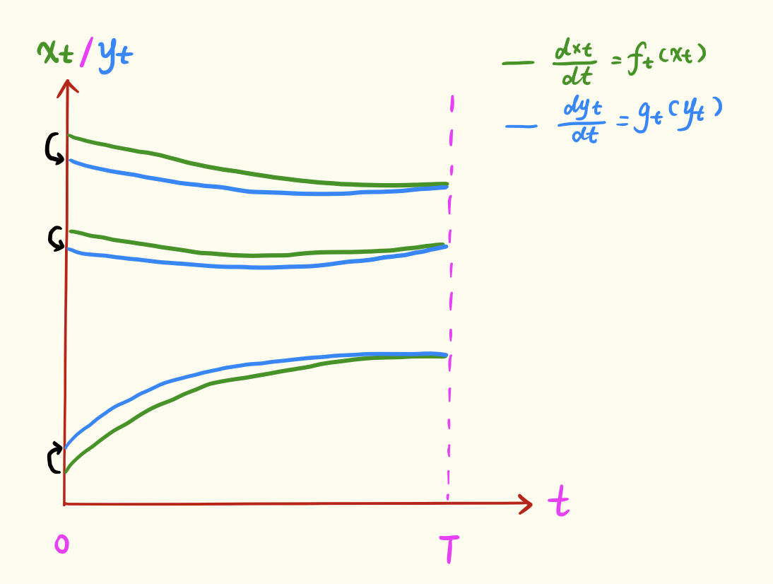 \begin{equation}\frac{d\boldsymbol{x}_t}{dt} = \boldsymbol{f}_t(\boldsymbol{x}_t),\quad \frac{d\boldsymbol{y}_t}{dt} = \boldsymbol{g}_t(\boldsymbol{y}_t)\end{equation}
