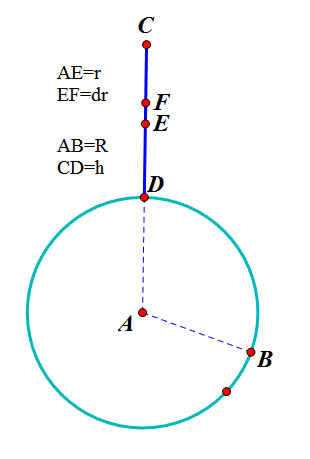 也许有的朋友会感到纳闷:为什么宇航局们非要一建就建数万公里的天梯,而不是先建数百或数千公里的天梯呢?下面我们来分析一下天梯的长度。为了尽可能比减少能源消耗,我们希望能够利用引力与惯性离心力来维持平衡。这就要求天梯高度要满足一定条件。为了简化计算,我们设想天梯是一根均匀的线,如图,设线密度为λ。由于天梯相对地球是静止的,因此线上的每一个点都在做角速度等于地球自转角速度的圆周运动(目前只考虑地球引力)。我们首先计算地球对此天梯的引力。设地球质量为M,天梯总质量为m。