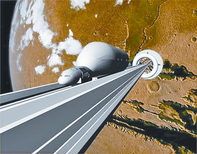 1895年,俄罗斯科学家首次提出太空梯概念,历经上百年研究,这个梦想仍未实现。太空梯基本上就是一条长长的缆绳---一端固定在地球上,另一端固定在地球同步轨道的平衡物(如大卫星)上。在引力和向心加速度的相互作用下,缆绳被绷紧,太空梯将利用太阳能或激光能沿缆绳上下运动。