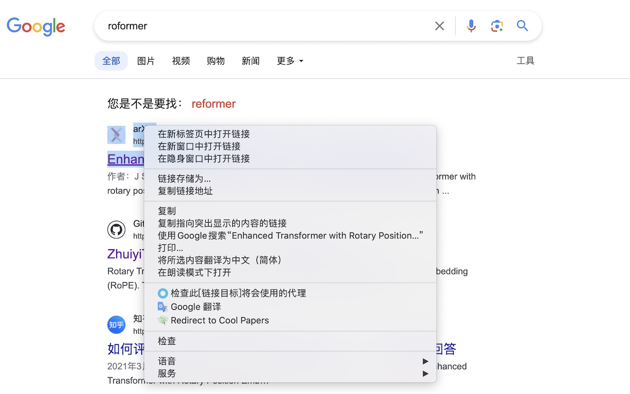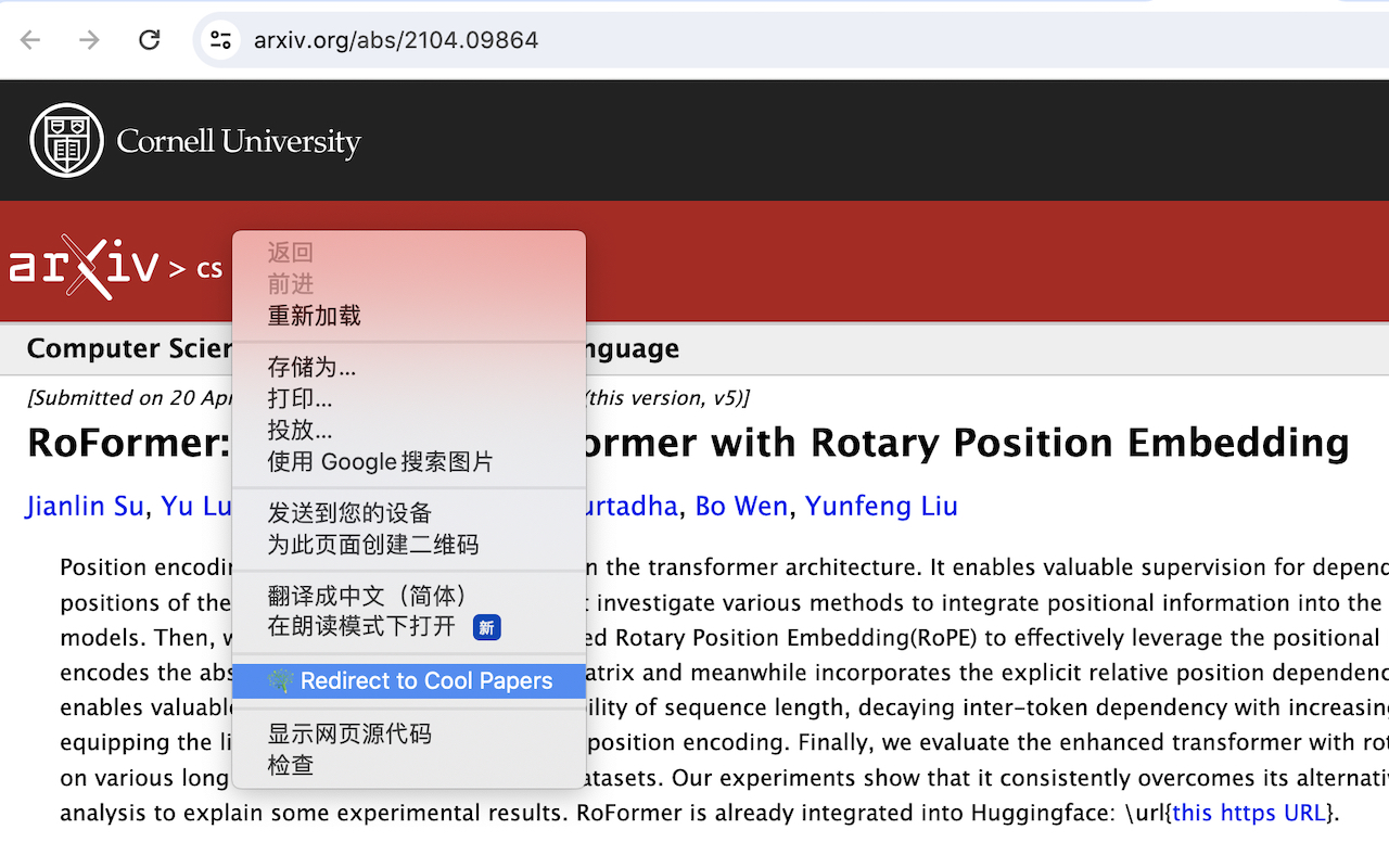 扩展的使用很简单,在Chrome安装成功后,以任意方式搜索论文,然后右击对应的地方(有时候空白之处也可以),会多处一个“Redirect to Cool Papers”的选项,点击该选项,浏览器会自动检测“所选文字”、“所选链接”或者“网站地址”可能存在的论文ID(检测到即停止),并自动跳转到Cool Papers对应的页面,效果如下: