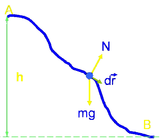 | 例1:滑雪运动员的质量为m,沿雪道从A到B下滑高度为h,忽略摩擦力。求这一过程合力作的功。 | |