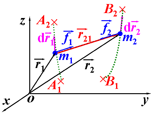 | 同一系统中出现的一对力称为内力,下面讨论系统中质点m1和m2之间的内力作功。 |