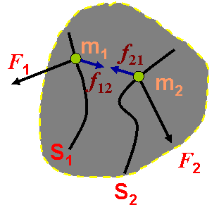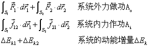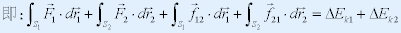 | 把动能定理由单个质点推广到质点系。 如图的两质点系统,其中F1,F2是外力,f12, f21为内力。 |