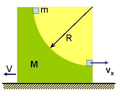 | 例:半径为R的1/4圆弧,质量为M,置于光滑平面上。其上质量为m的物体自顶由静止滑下,求m到底时,M在水平方向的移动 |
