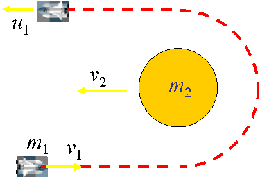 | 例:弹弓效应。土星质量为5.67×1025 kg,相对太阳轨道速率为9.6 km/s,一空间探测器以10.4 km/s 速率迎向土星飞行, |