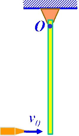 | 例1:一质量为m的子弹以水平速度射入一静止悬于顶端长棒的下端,求子弹和棒共同运动的角速度ω。已知棒长为l,质量为M. | |