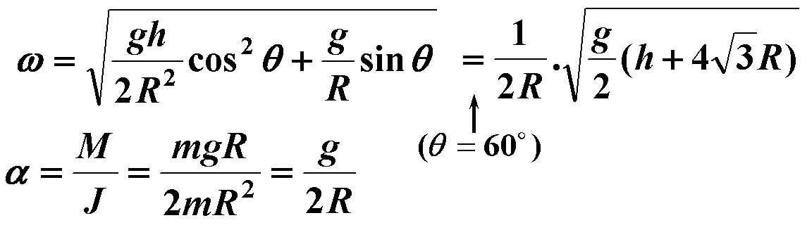 | 例2:如图示,已知:h,R,M=2m,θ=60度。求:碰撞后的瞬刻盘ω0=?P转到x轴时盘ω=?α=? | |