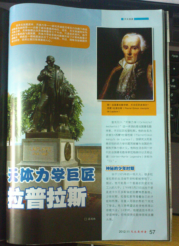 首先引入“天体力学(Celestial mechanics)”这一术语的是法国著名数学家、天文巨匠拉普拉斯。他的全名为皮埃尔?西蒙?拉普拉斯(Pierre?Simon marquis de Laplace),因研究太阳系稳定性的动力学问题被誉为法国的牛顿和天体力学之父。他和生活在同一时代的法国著名数学家拉格朗日以及勒让德(Adrien-Marie Legendre)并称为“三L”。