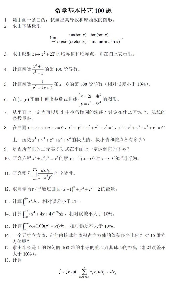 这是给物理系出的数学题,所以和一般的数学竞赛题目不同,没太多证明题,主要就是计算和解模型,而且还有不少近似估算的,带有明显的物理风格。虽然作者说这是物理系学生数学的底线,但即使对于数学系的学生来说,这些题目还是有不少难度的。网络也有一些题目的答案,但是都比较零散。在这里与大家分享一下题目。什么时候有时间了,或者刚好碰到类似的研究,我也会把题目做做,与各位分享。希望有兴趣的朋友做了之后也把答案与大家交流呀。