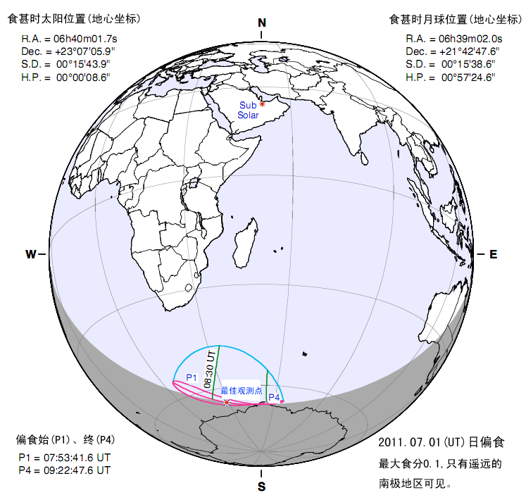 By 苏剑林 | 2011-05-28 | 33314位读者 | 引用6月中下旬,是北半球一年中黑夜最短的时期。今年6月22日是夏至节气,以北纬40°地区为例,当天天文昏影终到次日天文晨光始的间隔只有不到4小时50分钟。黑夜短暂会使我们可用于天文观测的时间缩短。但在夏至前后,午夜时分太阳也会在地平线下不太低的位置,这样我们就有可能整夜观测到一些类似国际空间站这样的低轨道人造天体。有兴趣的朋友可以查询相关的过境预报,挑战在一晚可以观测到多少次国际空间站过境这类的观测项目。发生在六月的日偏食和月全食,是今年天象的重头戏。接下来笔者就日偏食讲起,跟大家聊聊发生在6月的天象。