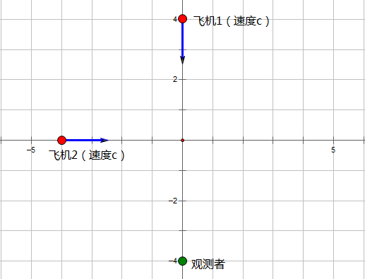 任意选定一个坐标原点。设想原点的正北方$c\cdot t_0$处有一架以光速$c$朝南运行的飞机1;原点的正西方$c\cdot t_0$处有一架以光速$c$朝东运行的飞机2。假设就这样匀速运动着,显然,$t_0$时间后,将会发生惨剧(飞机相撞)。
