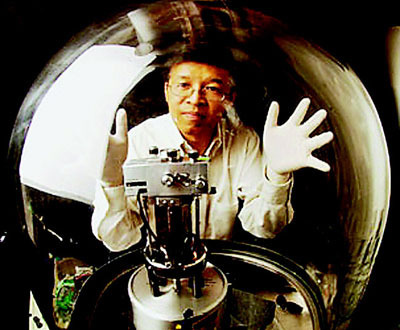 陈刚与实验用的真空室。 (美国《世界日报》/取材自麻省理工学院网站)